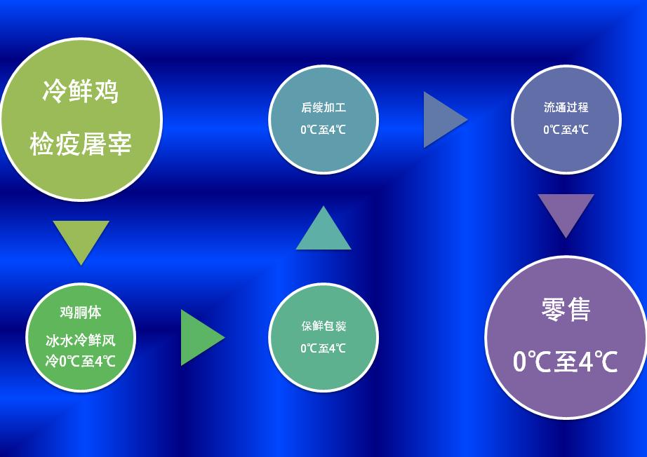 “冷鲜鸡”,是指对严格执行检疫制度屠宰后的鸡胴体进行冰水冷鲜、风冷,使鸡胴体温度在一小时内降为0℃至4℃,然后进行保鲜处理和包装,并在后续的加工、流通和零售过程中始终保持在0℃至4℃范围内。这对运输过程中冷藏车温度的要求最为严苛。
