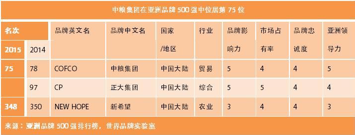 由世界品牌实验室和世界经理人集团共同编制和发布的2015年《亚洲品牌500强》排行榜于9月21日在香港揭晓, 其评价品牌影响力的基本指标依据三项指标:市场占有率、品牌忠诚度和全球领导力。这是世界品牌实验室第十次对亚洲品牌的影响力进行的测评, 共有20个国家和地区的500个品牌入选,韩国三星、日本索尼和中国工商银行名列前三,中国、日本和韩国是入选品牌最多的三个国家。 其中,中粮集团排第75位,较去年上升3位;新希望六和排第348位,较上一年提升2位。此前世界品牌实验室发布的2014年世界品牌500强排行榜显示,四大粮商中的ADM、邦吉榜上有名,前者排在第321位,后者排在第447位。四大粮商中的嘉吉、路易达孚并未上榜。