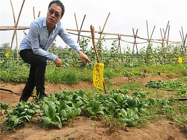 养鸡规模大了就面临鸡粪处理问题,一个上万规模的养鸡场,很快就会发现无处堆放鸡粪。而鸡粪是天然的优质农家肥,熟化后,可以用来种菜。在农场的菜畦里,可以看到一堆堆熟化好的鸡粪准备做底肥。叶子菜地里插满了黄色的诱虫纸。“黄色是为了吸引昆虫的注意,虫子飞过来的时候,就粘上了,每张纸可以用一周左右,”陈承斌说。
