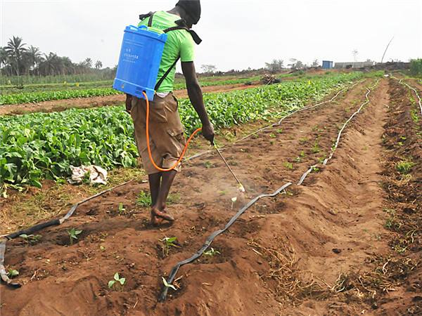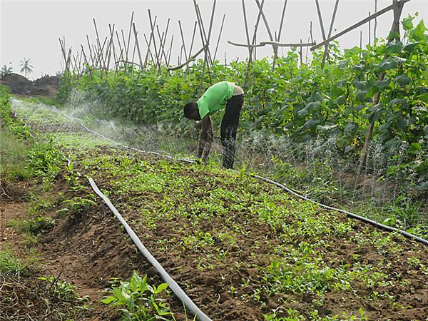 眼下正是尼日利亚的旱季,绿油油的菜地里,简易喷灌系统正在喷水,身着绿色工装的当地工人在忙碌地浇地、运送蔬菜或松土。为了解决当地旱季的灌溉问题,农场打了6口50米的深井,还从国内搞来了简易的喷灌系统,有些地方怕浇不透还需要工人一桶桶地人工浇灌。