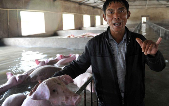 由于环保和防疫等限制,生猪无法转移,目前大雨持续,养殖场内水位继续上涨,留守场内的员工在撤离前最后一次涉水走进猪舍,与自己精心饲养的生猪诀别,场内6000余头生猪已无生存希望。图为李杰挥泪和浸泡在洪水中的生猪诀别。