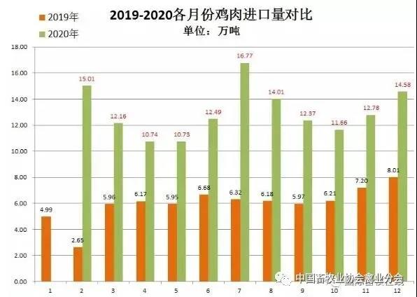 2020年1-12月,鸡肉(含整鸡、鸡块、鸡爪、鸡翅)累计进口量达143.30万吨,同比增加98.28%,累计进口额32.83亿美元,同比增加74.78%,平均到岸价格2291美元/吨,同比下跌11.85%;其中12月份进口量为14.58万吨,同比增加82.11%,环比增加14.11%,平均到岸价格2075美元/吨,同比下跌26.58%,环比下跌0.89%。