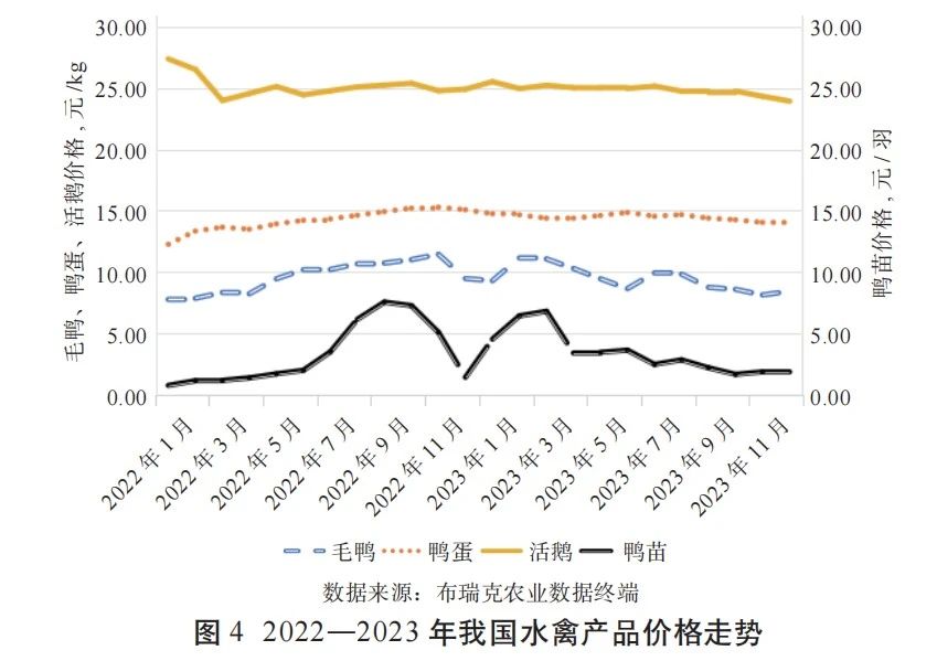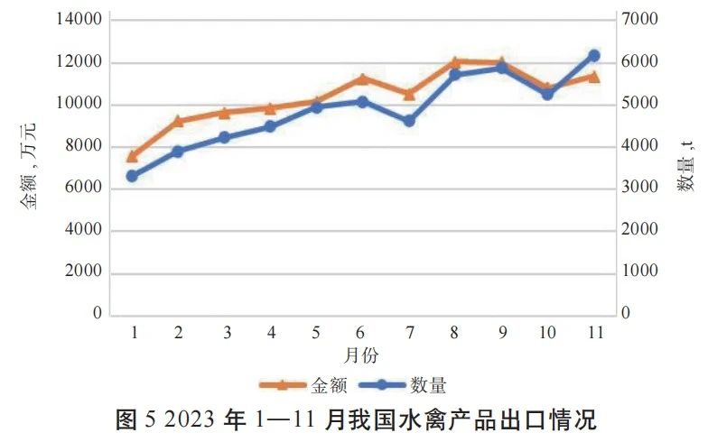 从水禽产品价格来看,进入2023年以来,水禽产品价格呈现出稳中有降的趋势,鸭蛋和活鹅价格波动较小,毛鸭和鸭苗全年价格存在较大波动(图 4);从对外贸易来看,2023年我国水禽进出口均呈现上升趋势,尤其是出口贸易有较大幅度增长(图5)。在国际市场上,我国水禽产品的进出口总量稳居世界第一的位置。从世界水禽贸易来看,各国进出口也呈现出上升趋势,预计2024年在严格防控禽流感等疫病影响下,世界各国水禽产品进出口贸易将进一步增长。