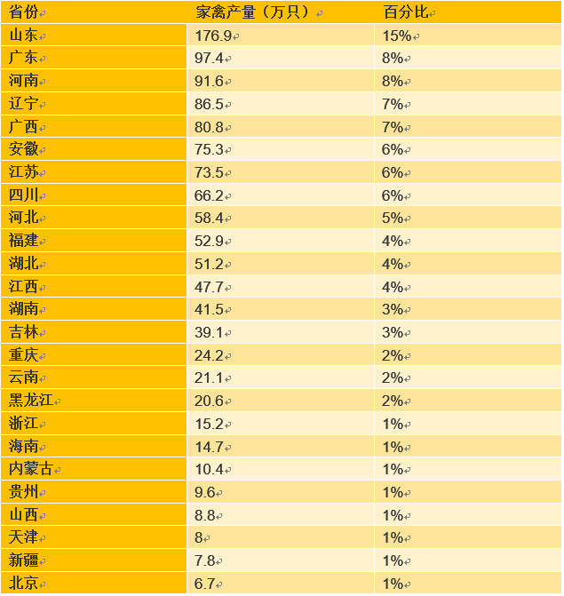 中国国内的家禽生产主要分为4种类型:黄羽肉鸡、白羽肉鸡、杂鸡和淘汰蛋鸡。从地域方面而言,黄鸡主要在南方生产,白鸡主要在北方生产。山东是目前中国最大的家禽生产商,产量在中国肉鸡总产量中的占比超过15%。