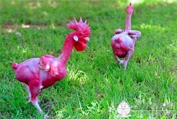 说起鸡,谁都见过,但在这绿油油的草地上发现的两只鸡,和平常的鸡长的却不一样。它们没有羽毛,浑身光溜溜,红通通的,仿佛刚被火烤过一样,远远看去还以为是两只火烈鸟。