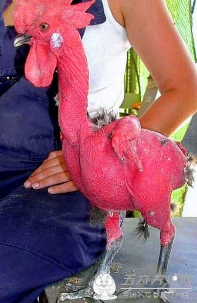 原来这是以色列新培育的鸡品种。这种无毛鸡比一般的鸡更为低碳,更加环保,而且肉质鲜美。零星可见几戳羽毛,翅膀清晰可见,除了无毛颜色红以外跟我们平常吃的鸡一模一样。