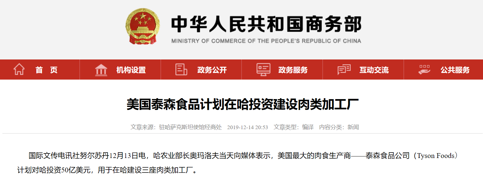 哈萨克斯坦农业部长奥玛洛夫12月13日向媒体表示,美国最大的肉食生产商——泰森食品公司(Tyson Foods)计划对哈投资50亿美元,用于在哈建设三座肉类加工厂。
