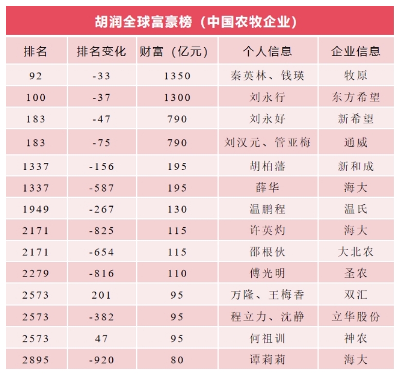 2024胡润全球富豪榜发布,农牧行业上榜14家!
