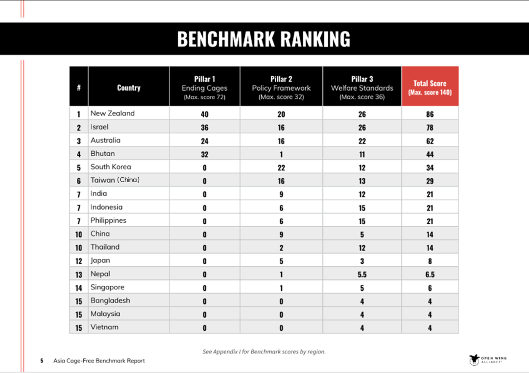 据其报告介绍,目前全球饲养超过48亿只商品蛋鸡,其中约30亿只(占比63%)位于亚洲,而亚洲有将近90%的蛋鸡都采用了笼养。此次评比便旨在针对全世界人口最多的地区,检视各国推动蛋鸡动物福利的政策与进展。评比指标共分为三个大类、31个小类,其中三个大类即“废除蛋鸡笼养进度”、“非笼养转型措施”和“蛋鸡动物福利规范”,满分分别为72、32和36(总分140)。亚洲地区总分最高的为86,最低的仅得4分。