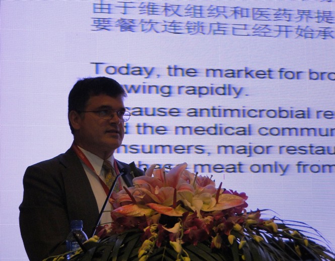 国际资深家禽专家 美国达农威公司客户食品安全总监Doug Smith在“改善家禽健康是保证食品安全的关键所在”的主题演讲中表示,消费者关心健康和食品的安全性。健康动物遭受的应激少,健康动物的生产性才能更佳。只有健康的动物才能产生安全的食品。目前,有些企业已在家禽养殖过程中,除治疗性抗生素除外,不使用其他抗生素,这是一个低投入、高利润的生态市场。通过对养殖管理、饲料原料、天然添加剂产品进行严格控制来实现不使用抗生素,更能支撑家禽的免疫系统。我们需要纯天然、未添加使用抗生素的药品来提高动物的健康水平。健康的动物生产性能好、且生产成本低。未使用抗生素的健康动物无抗生素残留、动物源性病原体对抗生素的耐药性较弱。上市前在家禽生长过程中进行抗菌处理,可降低对致病菌呈阳性反应的家禽数量以及进入食品加工厂中致病菌的总体数量。肉品加工厂再次抗菌处理效果会更有效,且生产出来的食品更安全。