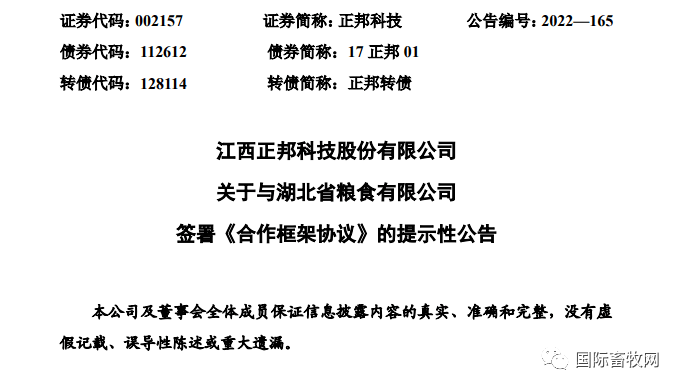9月15日晚,正邦科技发布公告称,公司与湖北省粮食有限公司签署合作框架协议,就合作打造湖北生猪养殖产业链达成协议。公司拟将其下属的部分生猪养殖产业相关资产转让给湖北省粮食公司,湖北省粮食公司进入生猪养殖行业。