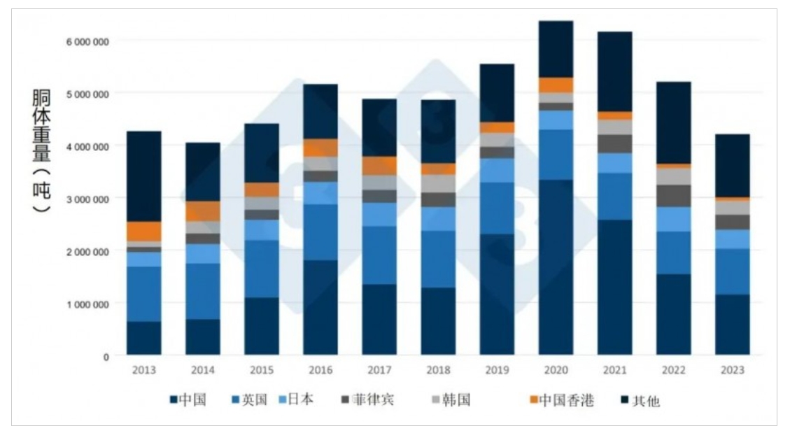 2023年,除了对英国猪肉出口量增长7%,欧盟对所有境外市场的猪肉出口量都出现了下滑,其中对我国和菲律宾分别下滑了25%和32%。在欧盟的猪肉出口总量中,我国的占比从2020年52%的峰值下滑至2023年的27%;英国则从2022年的16%上升至2023年的21%。