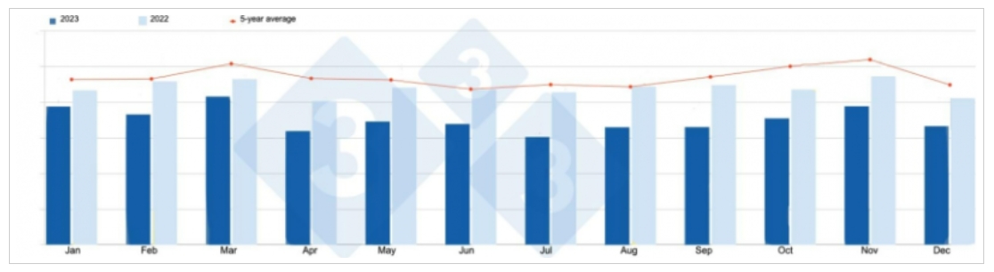 从月度出口量来看,2023年欧盟每个月的猪肉出口量均低于2022年同期水平,具体情况如下图所示: