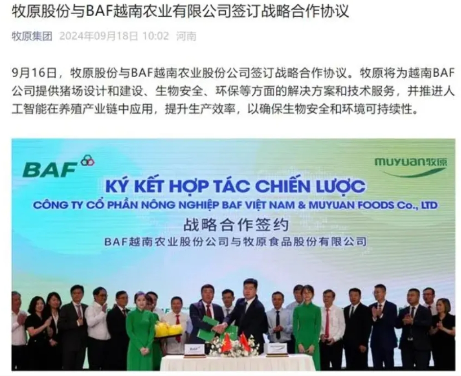 因此今年9月16日,牧原股份与BAF越南农业股份公司签订战略合作协议,引发关注。