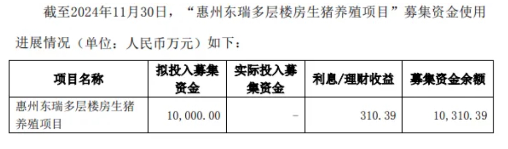 公告显示,“惠州东瑞多层楼房生猪养殖项目”达产后,将形成年出栏20万头商品猪产能。项目总投资55,000万元,拟使用募集资金10,000万元,截至2024年11月30日,该项目已累计投资2,699.17万元,均为自有资金投入,暂未使用募集资金投入。