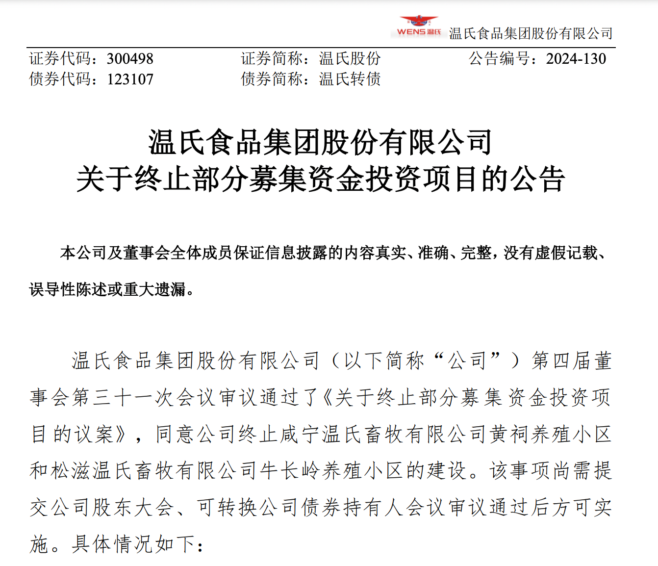 温氏股份宣布因环保风险和铁路规划原因,终止了咸宁温氏畜牧有限公司黄祠养殖小区、松滋温氏畜牧有限公司牛长岭养殖小区2个项目建设,投资额分别为5000万元和6000万元。