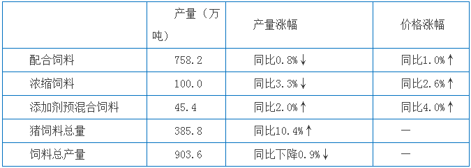 2017年上半年,据农业部重点跟踪的180家饲料企业数据显示,2017年1~6月份,饲料总产量903.6万吨,因受生猪收益下降影响,同比下降0.9%。根据饲料生产监测情况,1~6月,猪饲料累计产量385.8万吨大幅上涨,同比增长10.4%,其中,仔猪饲料、母猪饲料分别增长15.5%、10.8%,另外,添加剂预混合饲料45.4万吨,同比增长2.0%,配合饲料758.2万吨,同比下降0.8%;浓缩饲料100.0万吨,同比下降3.3%。