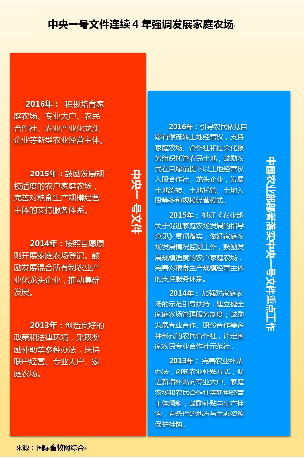 2016年,中国步入十三五开局之年。今年中央一号文件在延续前3年对发展家庭农场的要求上,提出“积极培育家庭农场、专业大户、农民合作社、农业产业化龙头企业等新型农业经营主体。” 以此,中国农业部在部署落实2016年中央一号文件重点工作(农业部关于扎实做好2016农业农村经济工作的意见)中亦强调,引导农民依法自愿有偿流转土地经营权,支持家庭农场、合作社和社会化服务组织托管农民土地,鼓励农民在自愿前提下以土地经营权入股合作社、龙头企业,发展土地流转、土地托管、土地入股等多种规模经营模式。探索农户土地承包经营权依法自愿有偿退出政策。加强对工商资本租赁农户承包地准入、监管和风险防范。加强农村经营管理体系建设,改进完善土地流转管理服务。