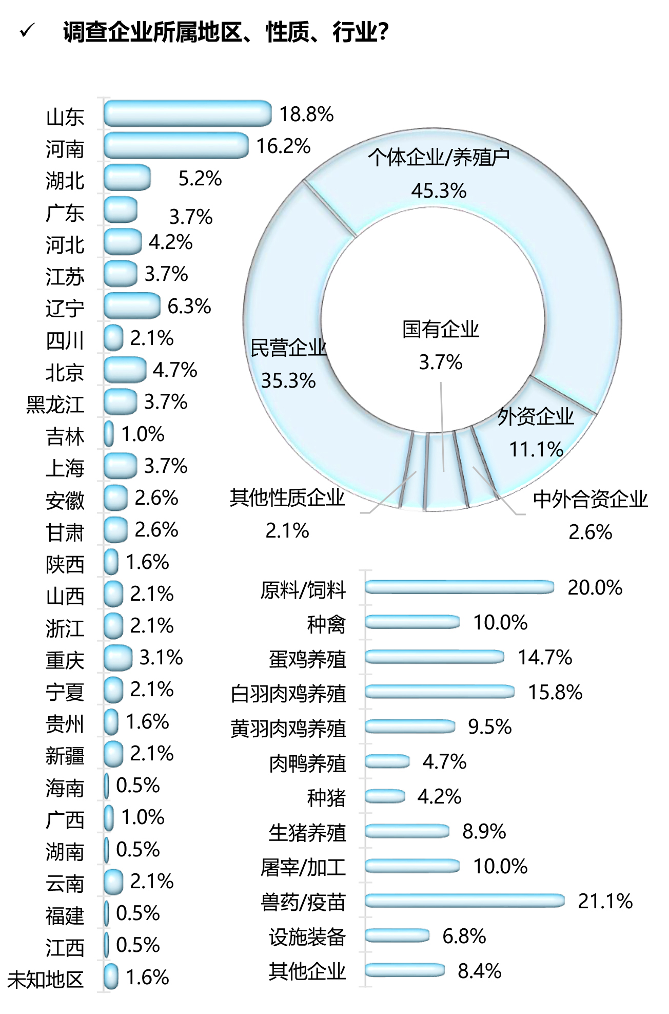 从目前收集到的样本数据来看,接受这次“新型肺炎疫情对您的企业影响有多大”在线调查的企业来自全国27个省区。其中,山东、河南养殖大省的企业较多,家禽企业占比约55%,民营企业、个体企业/养殖户占比分别为35.3%、45.3%。