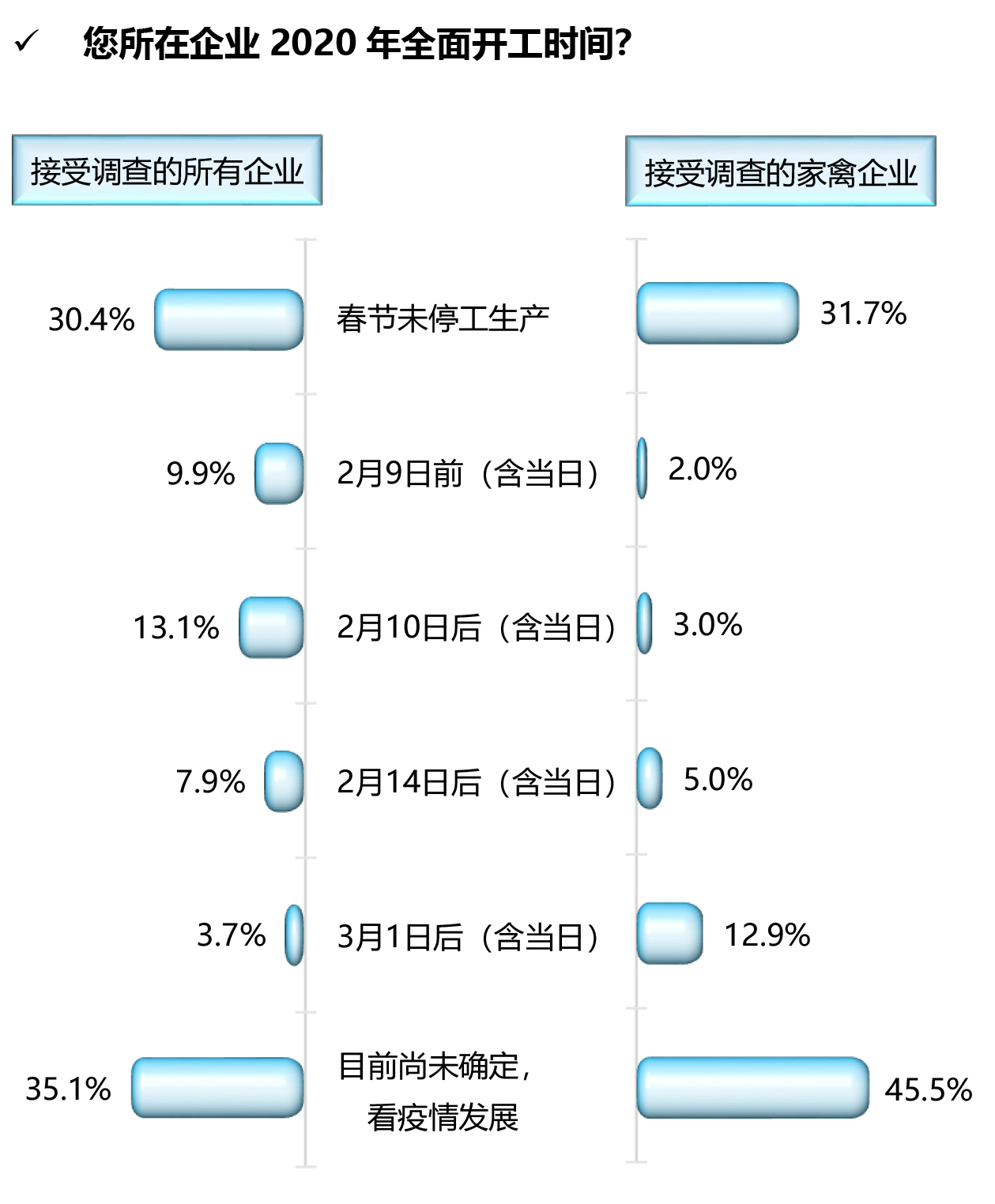 这次调查数据显示,接受调查的家禽企业(包括种禽、肉鸡、肉鸭、蛋鸡等)受访者当中,有31.7%的人回答“春节未停工生产”,有45.5%的受访者表示“目前尚未确定,看疫情发展”;有12.9%的人称“3月1日后(含当日)”全面开工。
