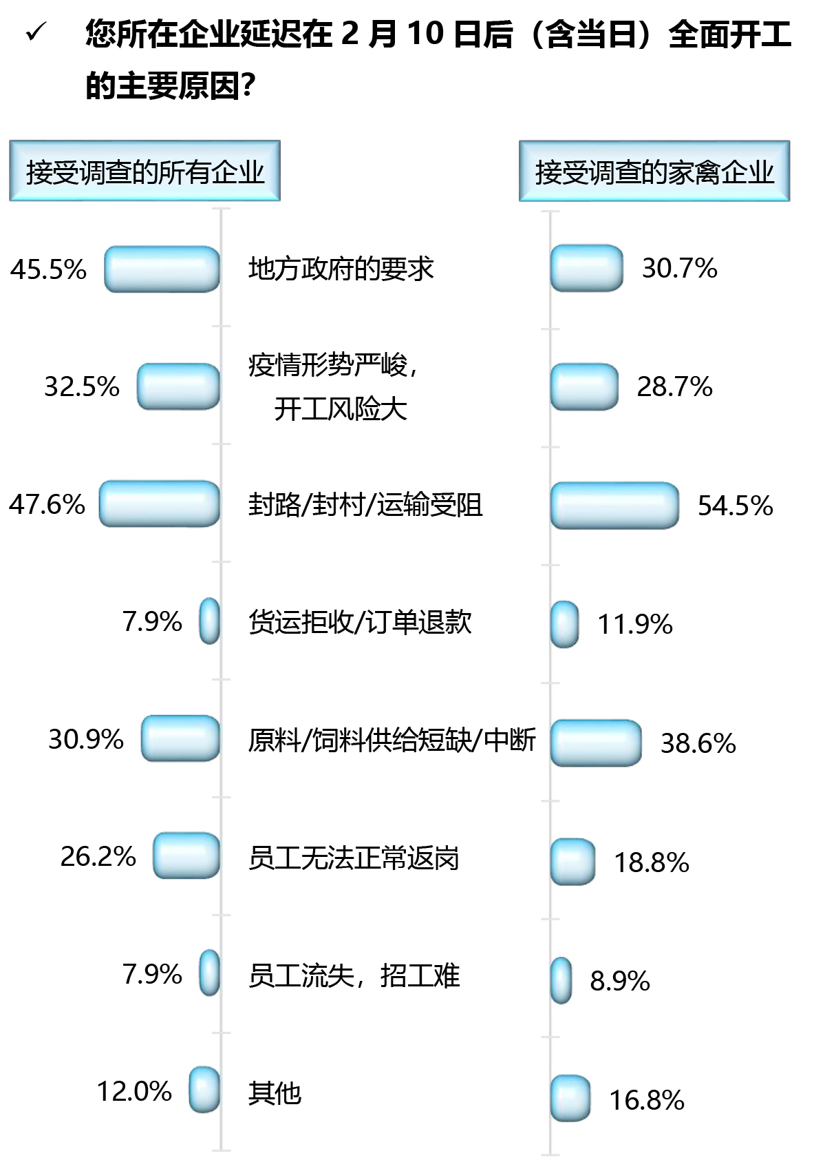 家禽企业中约2/3延迟开工,比畜牧企业高出逾6%