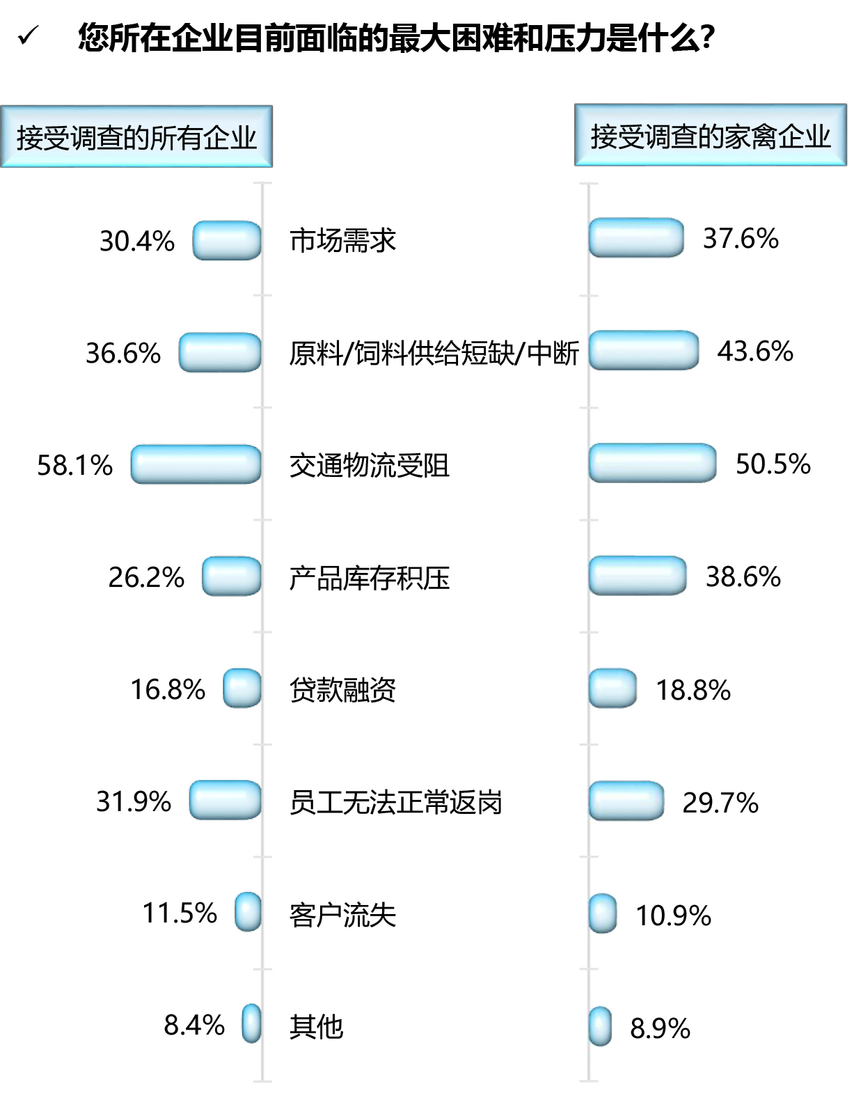 一半以上家禽企业因运输问题延迟开工,其次是原料问题