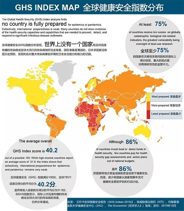 2019》报告显示,全球健康安全指数的平均得分为40.2分(满分100分),高收入国家的平均得分为51.9分,比世界平均分高11.7分;综合所有关键指标分析,国际方面对迅速传播的传染病(Epidemics)或全球大流行的传染病(Pandemics)的准备,仍然非常薄弱;在应对迅速传播的传染病或全球大流行的传染病方面,世界上没有一个国家做好完全准备。