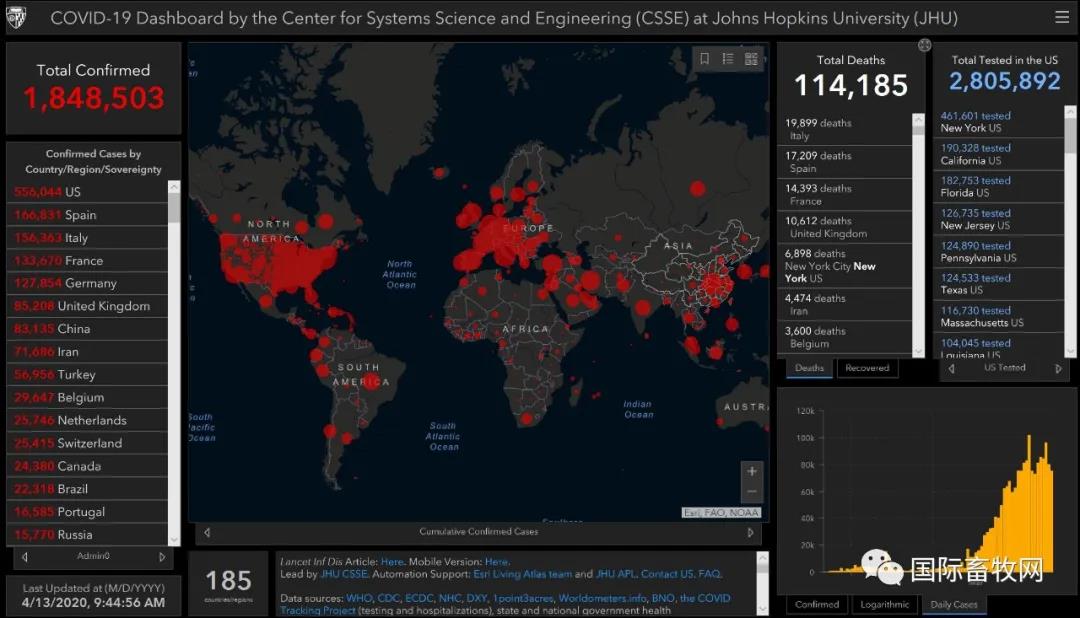 据约翰霍普金斯大学(JHU)实时监测数据显示,截至2020年4月13日北京时间9:44,全球新冠肺炎病毒确诊病例超过184万人,每4200人中就有1人被确诊感染;累计死亡人数超过11万,每100名确诊病例中有6人死亡,给全世界民众的生命与财产造成重大损失的同时,对人们健康的威胁程度越来越大。