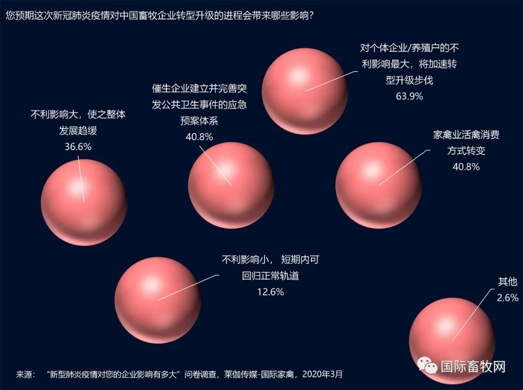 从科学家目前的研究进展与预判来看,对于不怎么怕热的新冠肺炎病毒,以当初非典的轨迹而依靠等待的可行性不太大。根据《国际家禽》杂志前期采访和调研多家家禽企业了解的情况以及针对新冠肺炎疫情对企业影响的调查结果,多数家禽从业者对未来发展信心十足,不但有忧患意识,而且有着良好期许。在接受调查的受访者当中,40.8%的人认为“催生企业建立并完善突发公共卫生事件的应急预案体系”,63.9%的人表示“对个体企业/养殖户的不利影响最大,将加速转型升级步伐”,40.8%的人回答“家禽业活禽消费方式转变”。