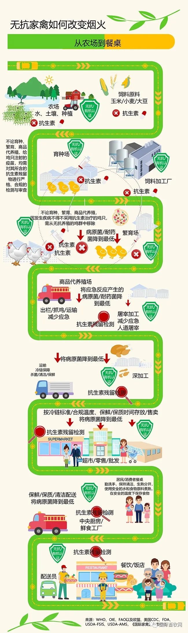 在欧盟国家,官方主要是有机认证,目前并未见报道有无抗认证的。在美国市场,如果标签上带有“无抗”类似字样说明的鸡肉等肉类产品,需要通过美国农业部“流程认证程序”(Process