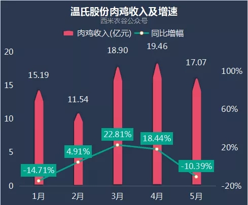 对于5月销售收入下滑,该公司表示,主要原因是上年同期鸡苗销售价格较高,本期鸡肉价格低迷,毛鸡收购价格下降,鸡苗销售价格下滑。