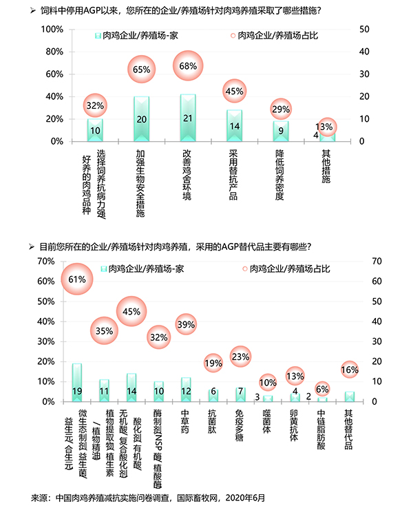 从实施减抗采取的方式来看,加强生物安全、改善鸡舍环境、采用替抗产品分列前三,其次是选择饲养抗病力强/好养的肉鸡品种、降低饲养密度以及其他措施。目前,这些肉鸡企业/养殖场采用最多的替抗产品是微生态制剂(益生菌/益生元/合生元),其次是中草药、酸化剂(有机酸/无机酸/复合酸化剂)、植物提取物(植生素/植物精油)、酶制剂(NSP酶/植酸酶),采用抗菌肽、免疫多糖、噬菌体、卵黄抗体、中链脂肪酸的占比较少。