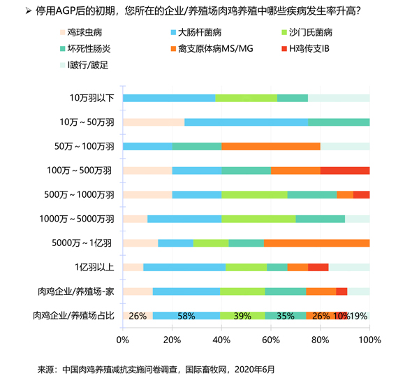 数据显示,减抗实施过程中,大肠杆菌病发生率高的企业/养殖场较多,其次是沙门氏菌病和坏死性肠炎,鸡球虫病、禽支原体病MS/MG、鸡传支、跛行/跛足、鸡球虫病较少。此外,养殖规模大小与疾病发生率升高并没有明显关系。