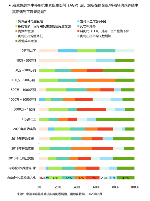 这些肉鸡养殖企业/养殖场主要分布在山东、河北、河南及辽宁、江苏、广东等地,多数(2/3)拥有配套饲料厂自己生产饲料。从这些企业/养殖场的调查数据来看,它们减抗遇到的问题与养殖规模大小、减抗实施时间长短并没有明显的相关性。