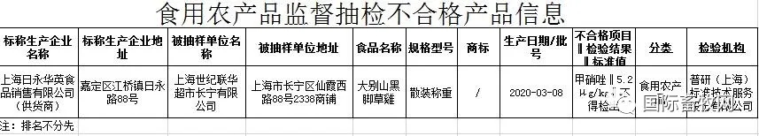 6月17日,上海市市场监督管理局发布了2020年第22期省级食品安全监督抽检信息显示,上海世纪联华超市长宁有限公司销售的由上海日永华英食品销售有限公司供货的1批次大别山黑脚草鸡(生产日期2020/3/8),甲硝唑项目不合格,检出值为5.2μg/kg,原农业部公告第235号规定为不得检出。