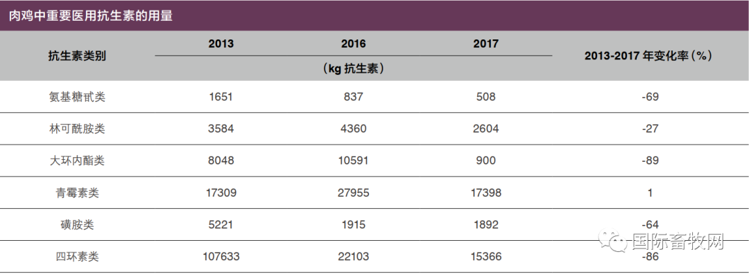 Singer作为发布于2019年8月的《2013-2017年美国肉鸡和火鸡养殖场抗生素用量评估》研究报告的作者之一,Singer表示,最近几年,美国肉鸡业和火鸡业中抗生素的使用显著减少,肉鸡业和火鸡业的抗生素管理正呈全面改善的态势。最终收集的数据覆盖了指定期限内总饲养量72%~93%的肉鸡和77%~82%的火鸡。2013年,养殖场所进肉雏鸡约有93%服用或接触过抗生素。到2017年底,这一数字降至17%。对于火鸡,同期比例由96%降至41%。其中,肉鸡抗生素使用的主要变化为:孵化场中接受抗菌药物的肉鸡从93%降至17%;孵化场庆大霉素的使用量减少约74%;医学上重要的饲料中抗菌素在肉鸡中的使用减少了多达95%。例如:四环素95%,维吉尼亚霉素60%;医学上重要的水溶性抗菌剂在肉鸡中的使用减少了多达72%。例如:青霉素21%,四环素47%,磺酰胺72%。