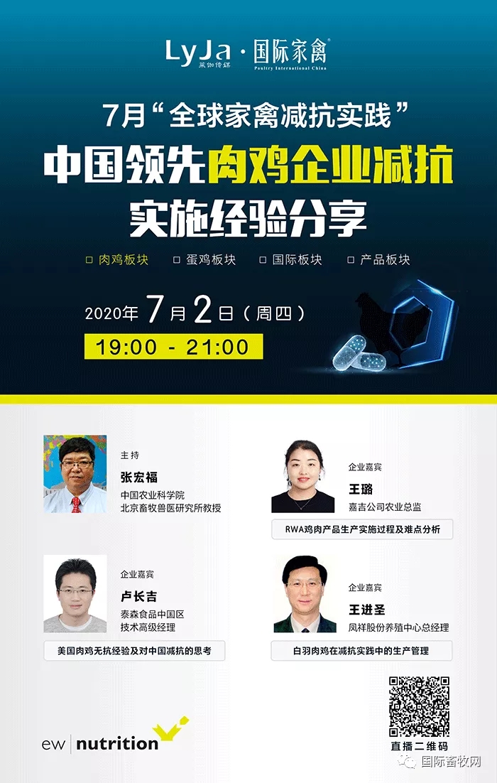 在此之际,莱伽传媒携《国际家禽》于5月发起无抗年度专题,和大家一起探索出一条适合中国国情的无抗路。于7月开展“全球家禽减抗实践”专题直播会议,为大家在线展现先进的无抗经验。7月2日,“肉鸡板块”直播会议将为全国肉鸡企业呈现嘉吉公司的饲养无抗(RWA)鸡肉饲养经验和难点、泰森食品带来的美国先进无抗经验和可借鉴之处、中国最大的肉鸡生产加工出口企业之一——凤祥股份是如何实施禁抗和减抗措施的,为中国的无抗之路点亮明灯。