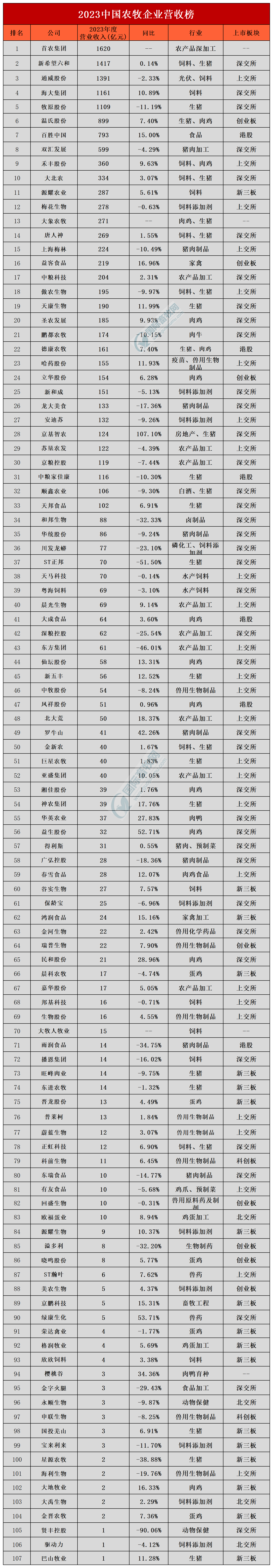 本次榜单涵盖饲料、生猪、肉鸡、蛋鸡、食品、农产品加工、兽用生物制品、饲料添加剂等行业。小编根据上市企业、新三板及公司公告等汇总出中国107家农牧企业营收榜。