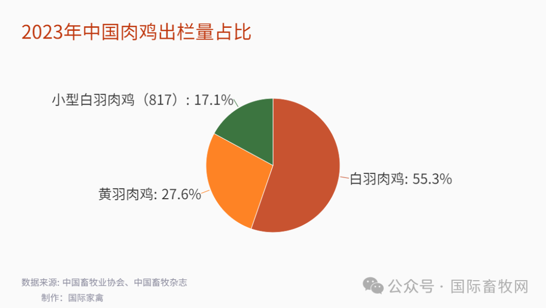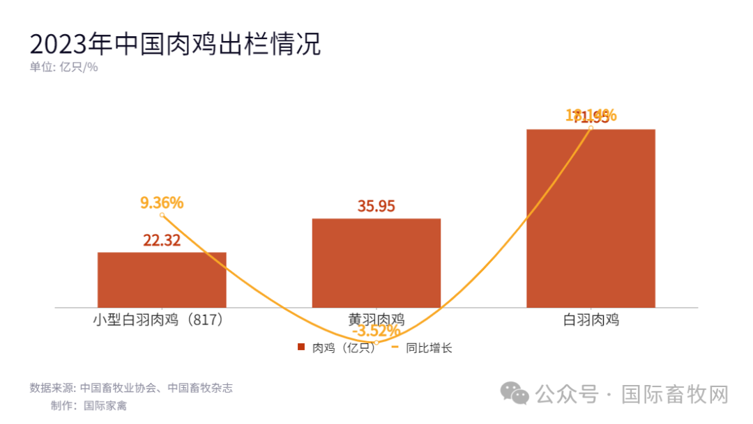 2022年小型白羽肉鸡(817)出栏量为22.32亿只,较2022年增长9.36%;产量为255.68万吨,较2022年增长6.18%。