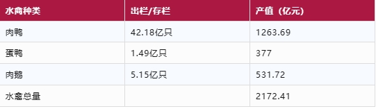 42.18亿只,较2022年增长5.40%;肉鸭总产值1