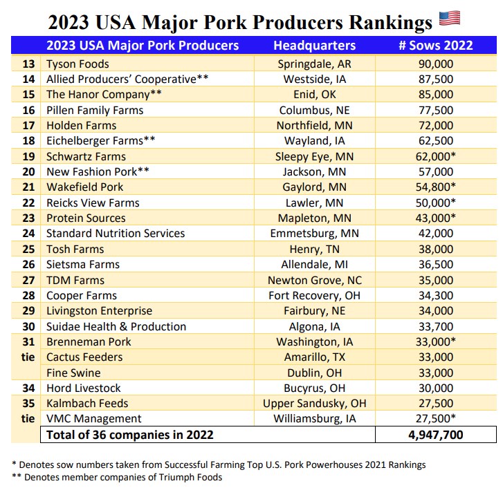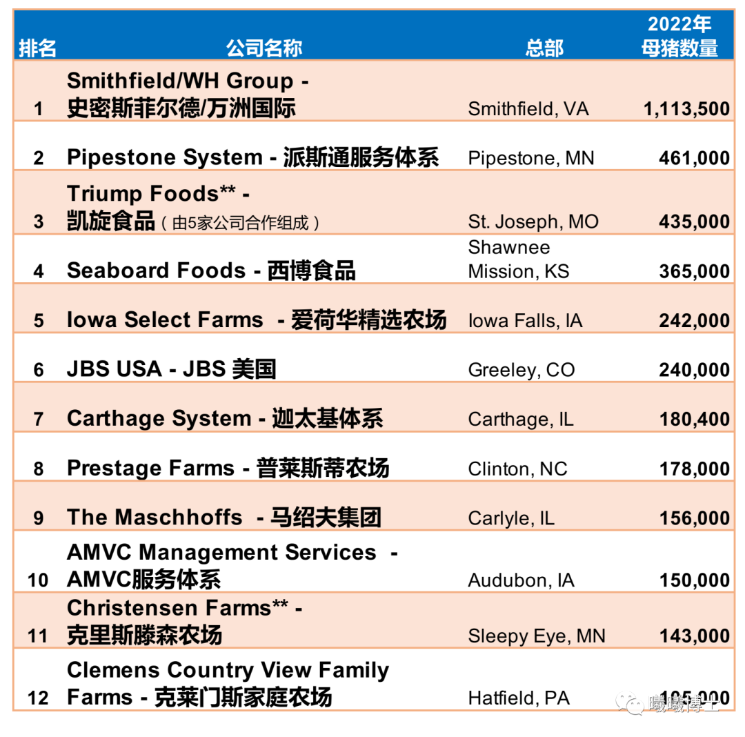 今年Genesus还与 Swineweb 一起列出了美国主要猪肉生产商的名单。这些主要生产商——拥有超过 25,000 头母猪的生产商。今年的美国主要猪肉生产商名单上有 36 家公司,占美国母猪总数的 2/3 以上。