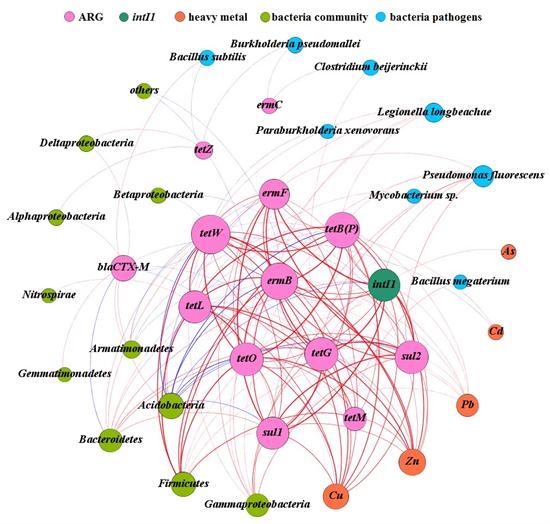 ARGs与intI1、重金属、细菌群落以及病原细菌的相关性网络图