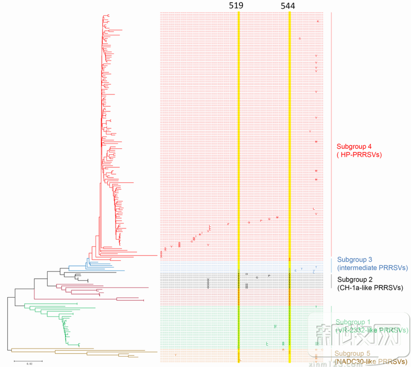 图1. 北美型PRRSV全基因组序列进化分析及突变氨基酸的位置