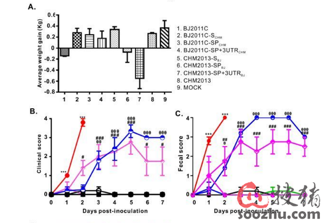 中国农业大学动物医学院猪病研究团队前期构建了基于流行毒株BJ2011C和低致病性毒株CHM2013的反向遗传操作平台(Li, et al, PLoS one,2017)。本研究在此基础上构建并拯救互换S基因、整个结构蛋白编码区(SP)以及3UTR的嵌合病毒,然后利用2日龄健康仔猪感染模型进行了致病性试验。研究结果发现,互换S基因后,BJ2011C失去致病性,但并未使CHM2013获得致病力。相反,互换SP编码区后,CHM2013嵌合病毒获得肠道定殖能力,引起典型PED临床症状,感染猪只持续排毒,且有明显肠道组织损伤。进一步交换3UTR后,CHM2013嵌合病毒毒力增强,引起部分猪只死亡(图一)。上述研究揭示,PEDV流行毒株毒力是多因子作用结果,S基因仅是BJ2011C致病的必要条件,结构蛋白编码区促进病毒在PEDV在仔猪肠道内定殖,并和3UTR协同作用,影响病毒致病力。本研究结果为阐明PEDV流行毒株的致病机制提供了科学依据,并为PEDV疫苗设计提供了重要的思路。