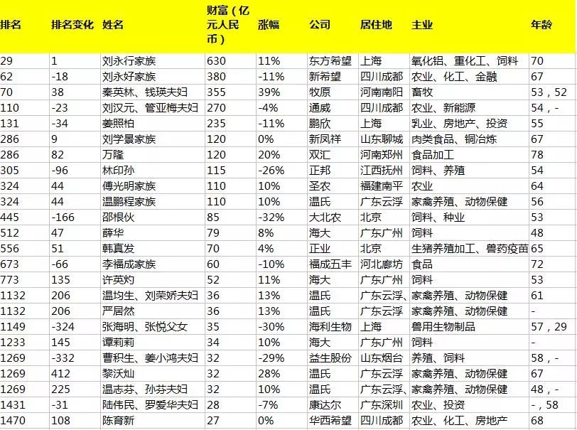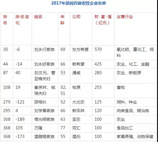 与2017年的富豪榜单对比,秦英林夫妇的财富进一步提升,超过刘汉元夫妇进入中国富豪榜百强,大北农董事长邵根伙财富下滑较快,而雏鹰农牧侯建芳今年落榜,温氏是农牧业制造富豪最多的企业。