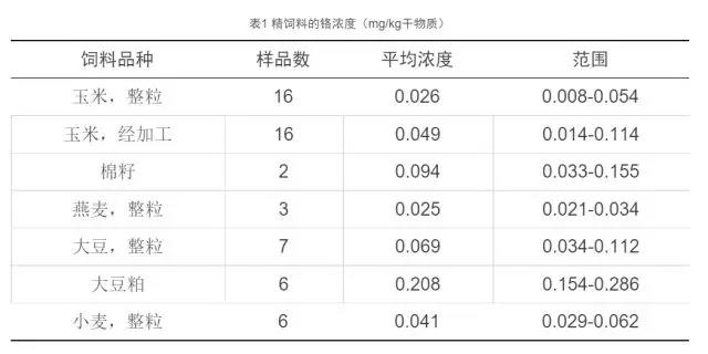 整粒棉籽和大豆比粮食谷物具有明显较高的铬浓度。在该研究中,大豆粕含有所评估精饲料中最高的铬浓度。