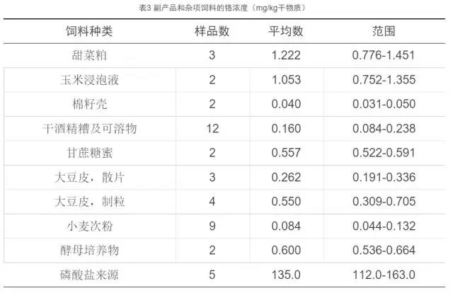 甜菜粕较高的铬浓度,可能是由于较严重的泥土污染,因为甜菜生长于地下。除了甜菜粕和玉米浸泡液以外,其他副产品饲料原料的铬浓度,平均少于每kg干物质0.60mg。