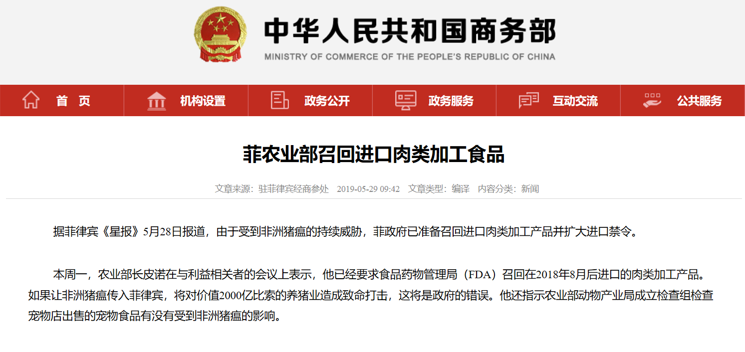 据菲律宾《星报》5月28日报道,由于受到非洲猪瘟的持续威胁,菲政府已准备召回进口肉类加工产品并扩大进口禁令。