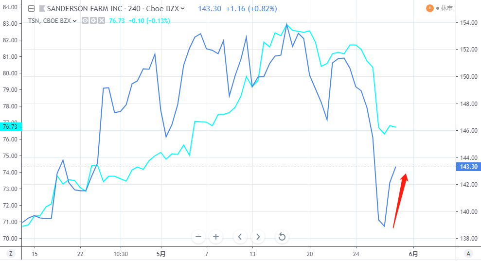 本周三,农作物价格的集体上涨一度使美国家禽养殖业股票集体遭到抛售,龙头企业泰森(Tyson)跌幅一度高达5%,桑德森农场也收跌4.5%。但随着较好的营收数据公开,桑德森农场股价大幅回升,截至隔夜美股收盘涨3.18%。