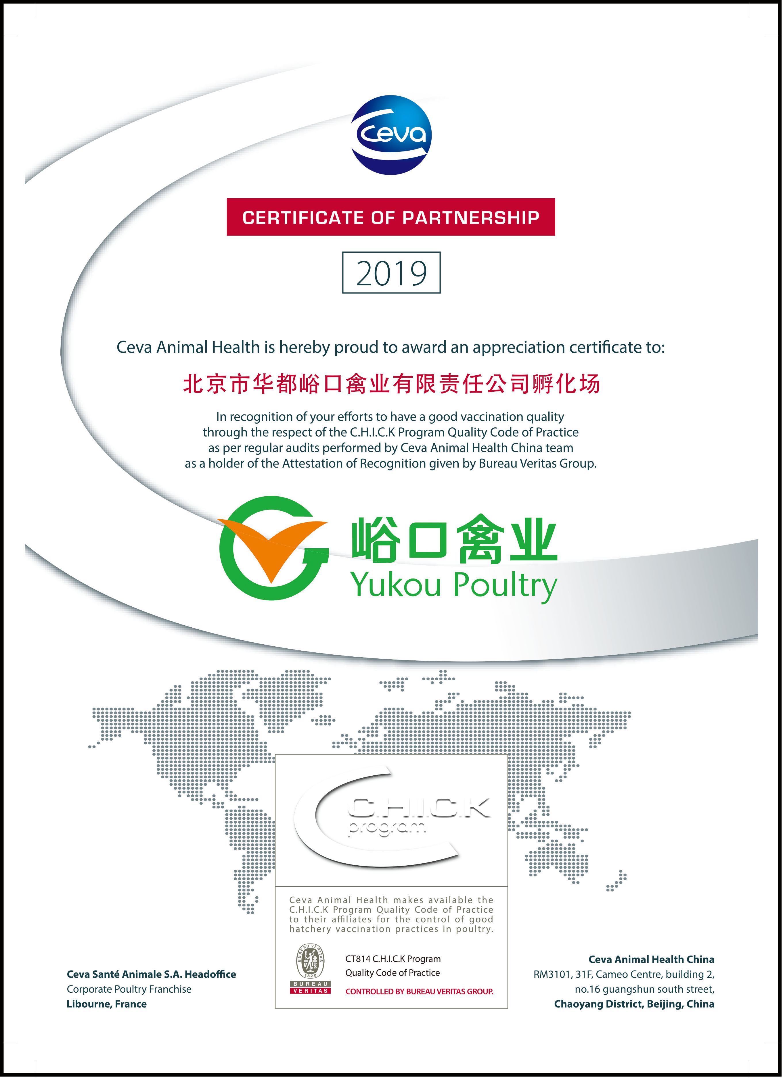合作伙伴证书的颁发充分肯定和表彰了峪口禽业在过去一年里严格落实必维国际检验集团认证的诗华C计划的各项要求,各个项目审核的分数都在95分以上,确保了良好的孵化场免疫质量,诗华C计划将继续为峪口禽业打造4A级鸡雏项目保驾护航!